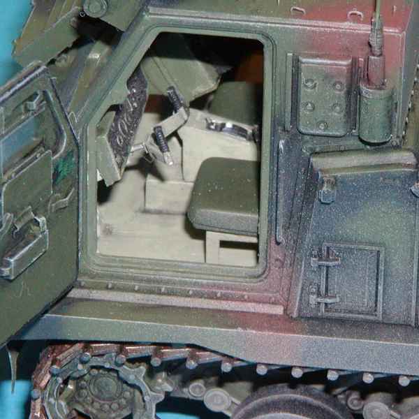 Das Dach wurde noch nicht angeklebt, da sonst die Bemalung des Innenbereichs nur noch schwer möglich ist. Im Innenraum habe ich noch die Haltegriffe für den Beifahrer mit 0,8mm Draht ergänzt. Am Funkgerät an der Rückwand kam noch einige Kabel aus Messingdraht hinzu und das Gas- und Bremspedal wurde aus 0,3mm Alublech neu aufgebaut. Jetzt konnte die Kabine innen mit Palegreen gespritzt werden. Nach der Detailbemalung mit dem Pinsel erfolgt ein Washing und Drybrushing und verleit dem Ganzen eine räumliche Tiefe. Jetz konnte die Kabine auf die Wanne angebracht werden. Während dem Bau stellt ich immer wieder fest, dass die Passgenauigkeit bei diesem Bausatz nicht die beste ist. An vielen Stellen musste immer wieder nachgearbeitet und gespachtelt werden. Aussen an der Kabine habe ich alle Griffe aus Messingdraht neu erstellt. Die Griffe auf dem Dach waren vorallem davon betroffen.