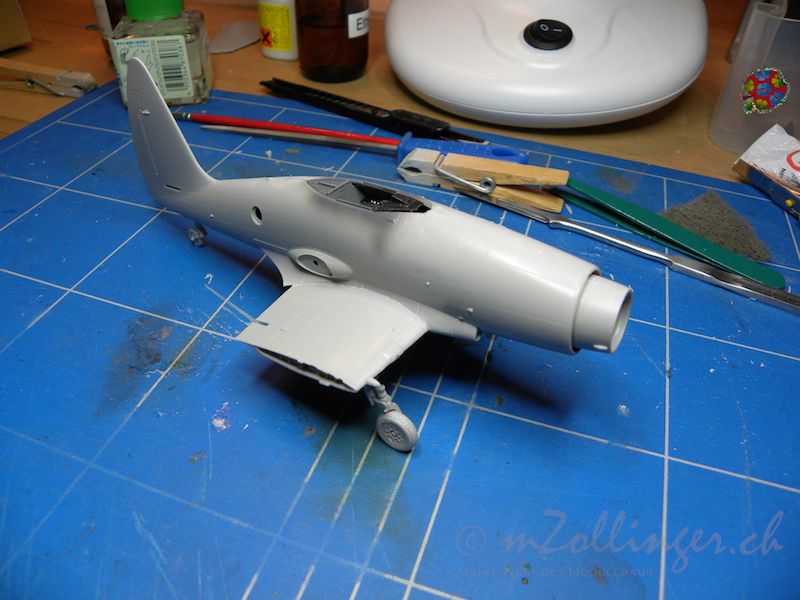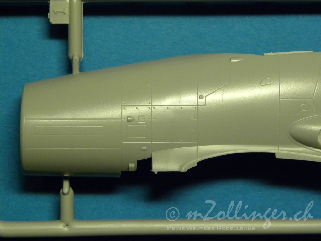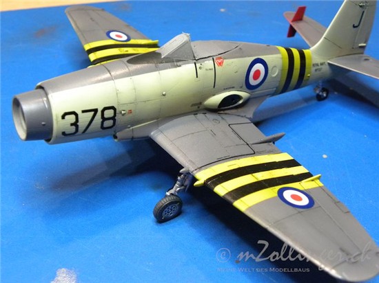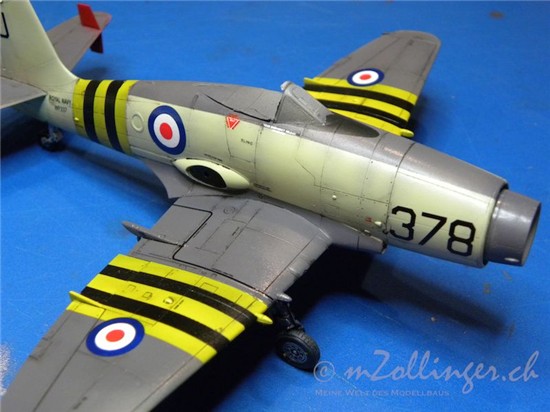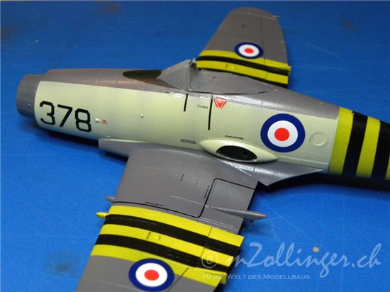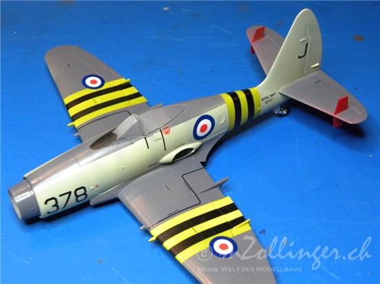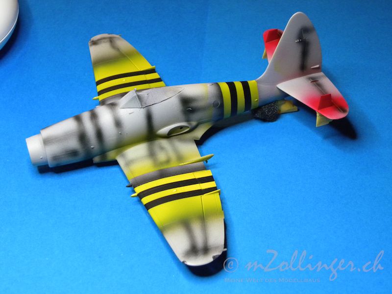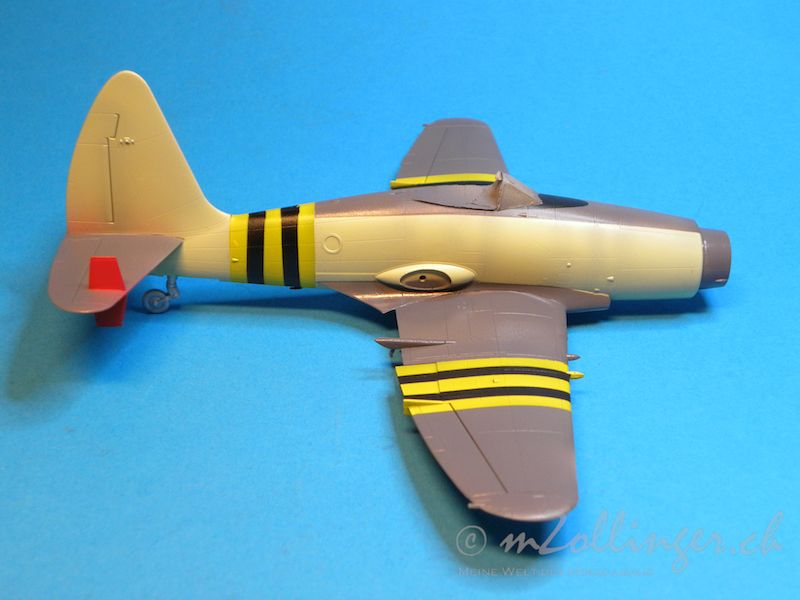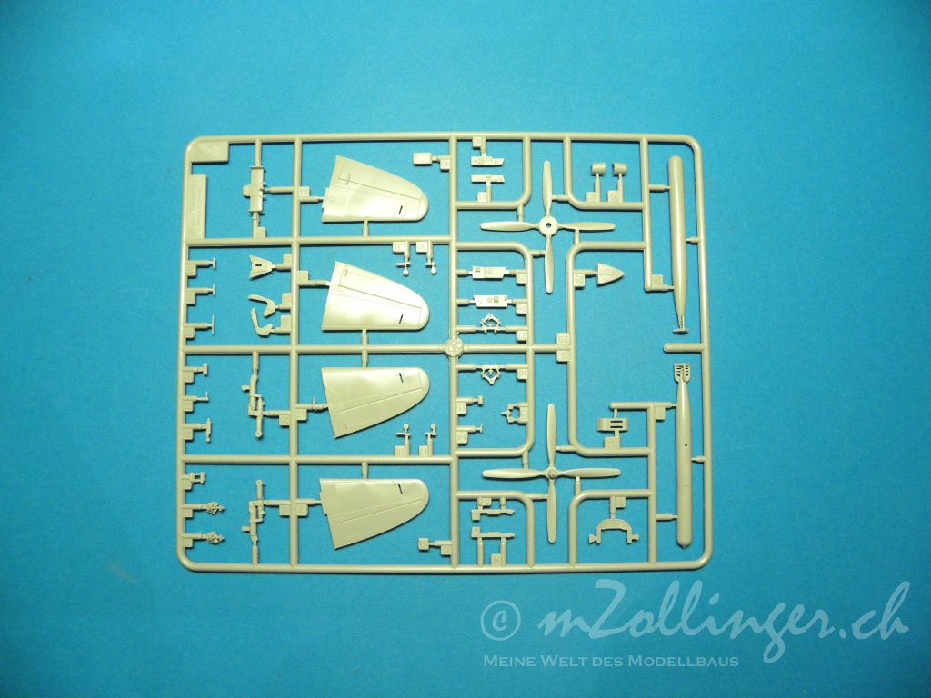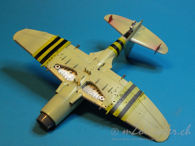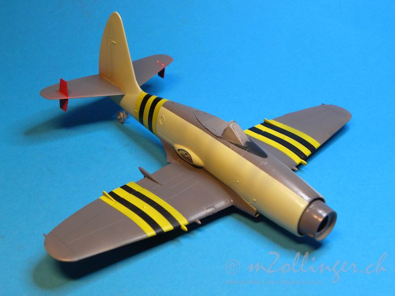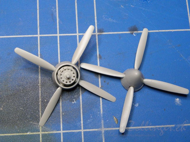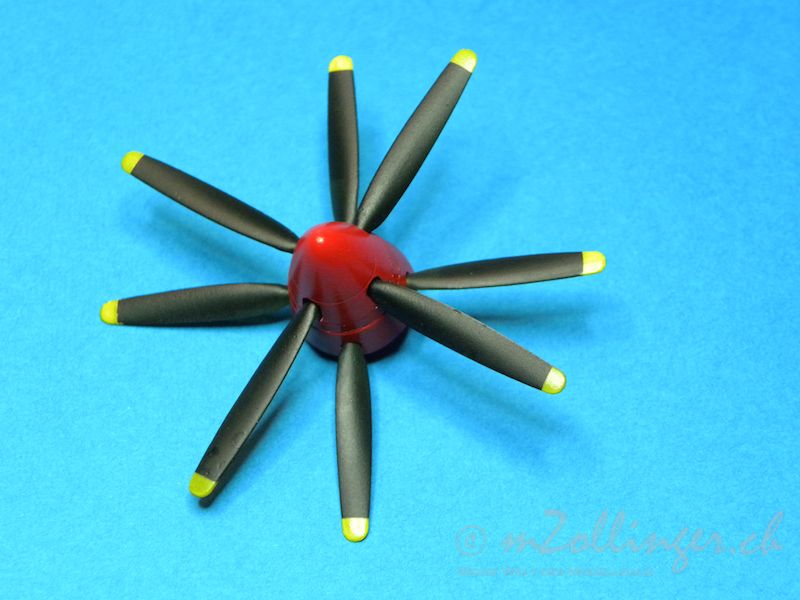 Da die Streifen nicht als Decal beiliegen, müssen diese in Eigenarbeit aufgemalt werden. Der Propeller ist eine Augenweide für sich.