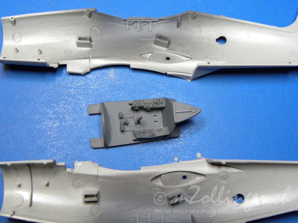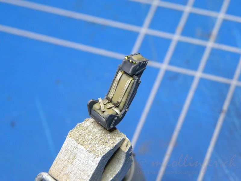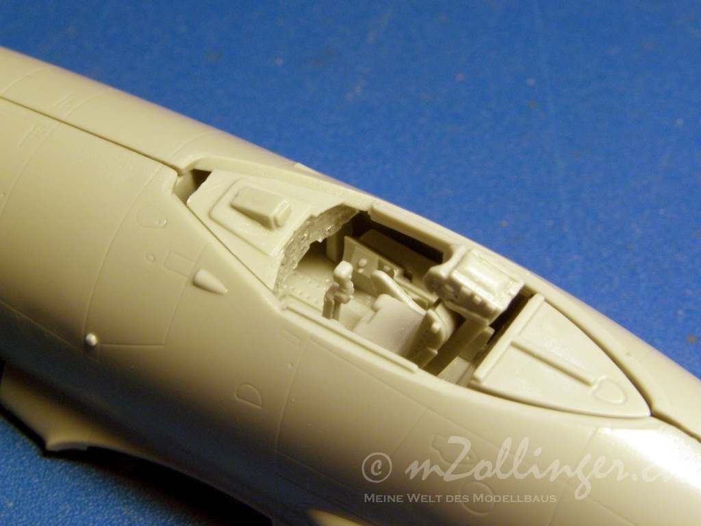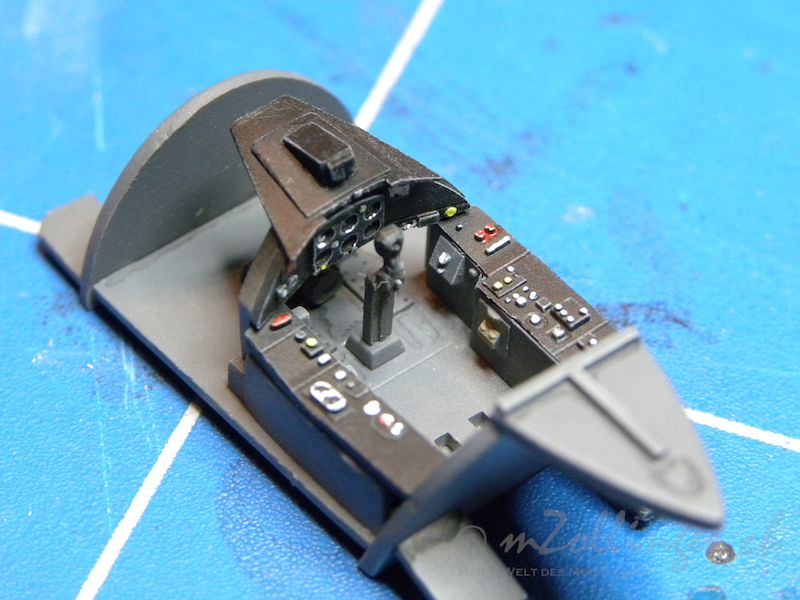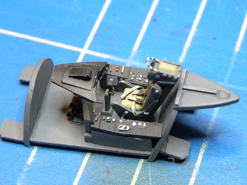 Hier nochmals alle Einzelteile des Cockpits. Jetzt fehlt nur noch die entsprechende Bemalung. Die Grundbemalung ist nun gemacht und es müssen nur noch die Details hervorgehoben werden. Die Instrumente sind lediglich mit einem feinen Pinsel bemalt worden was durchaus reicht. Die Gurte sind Ätzteile einer Farey Fulmar die ich noch in der Restekiste hatte. So wird nun das Cockpit im Rumpf eingebaut. Der Schleudersitz ist noch nicht festgemacht und wird zur Bemalung nochmals entfern.
