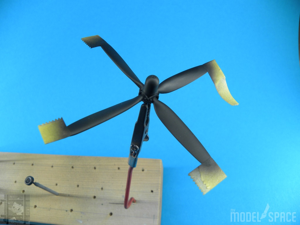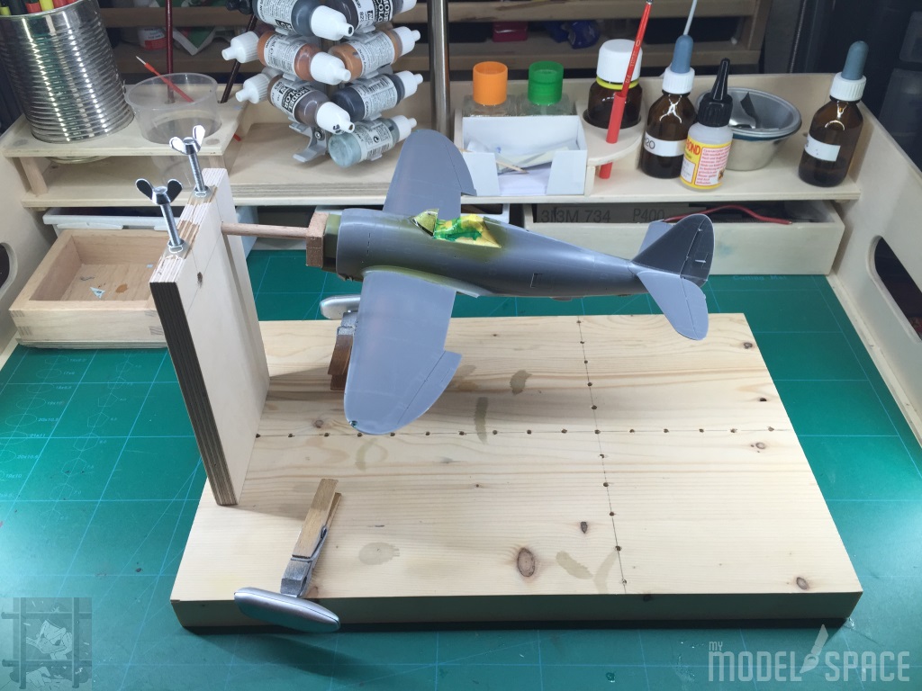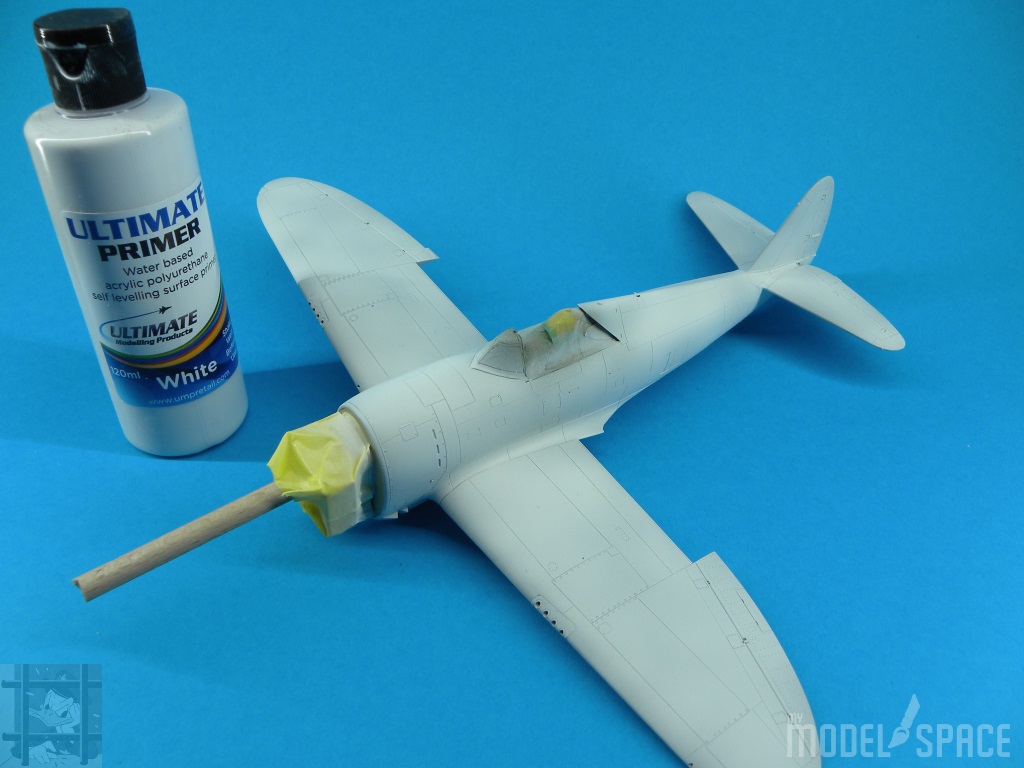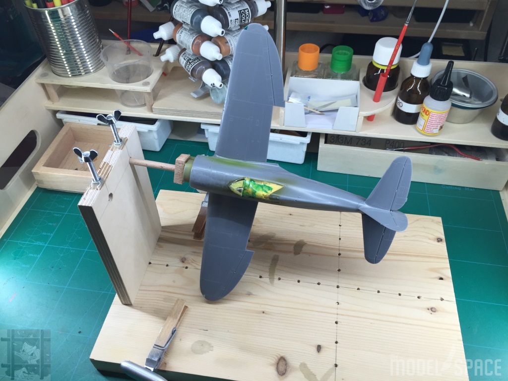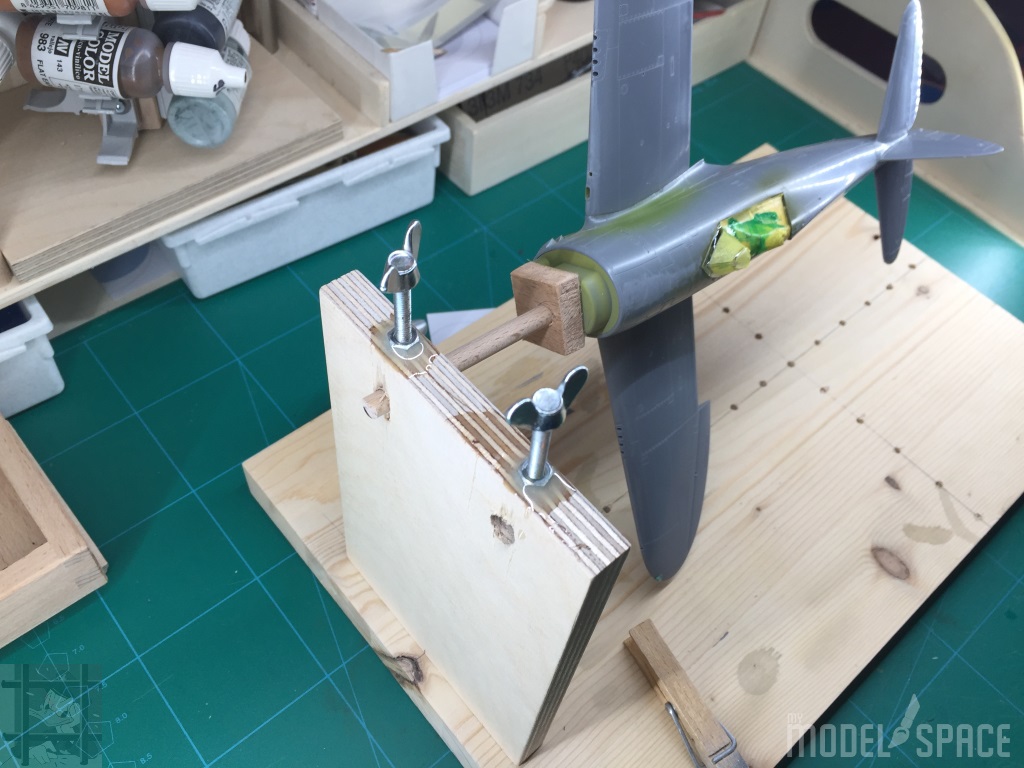 Die P-47 bereit für die Lackierung. Die Fahrwerkschächte habe ich mit einem nassen Papiertaschentuch ausgelegt und vorne kam ein Flansch dran damit ich den Flieger in meiner Airbrushhalterung befestigen kann. Es ist wichtig bei einer solchen Bemalung eine gute Handhabung des Modells zu haben, nur so ist ein sicherer Halt gewährleistet.